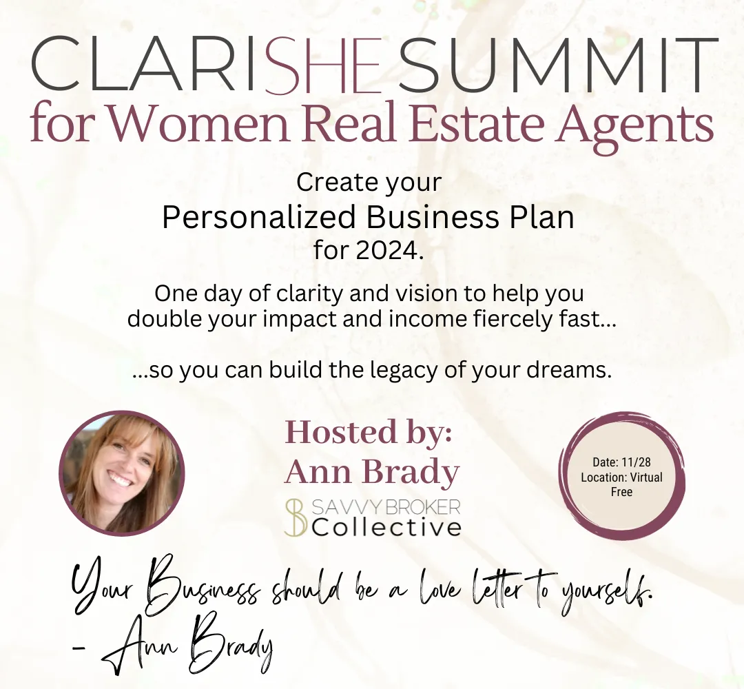 Position yourself for success in the coming year by finding your path of clarity, reduced stress, and more time freedom. Join your host, Ann Brady, Broker and author of The Savvy Seller Collective alongside a team of expert coaches, for engaging interactive workshops, clarity-creating sessions, personalized business planning, and meaningful connections.